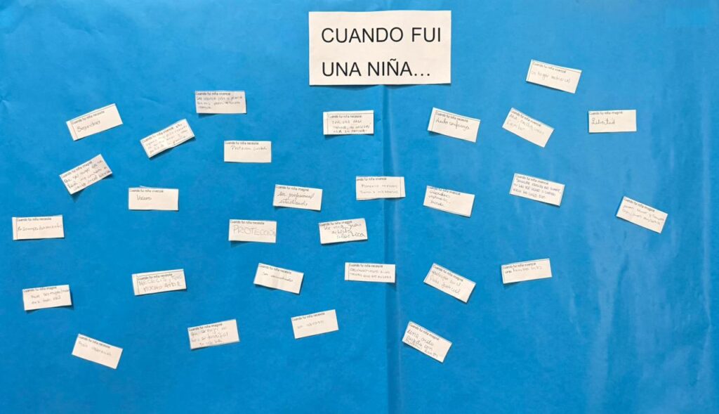 Las participantes dejaron por escrito recuerdos, necesidades y anhelos de su infancia bajo la consigna “CUANDO FUI UNA NIÑA…”. En los testimonios expuestos surgieron palabras y experiencias profundas que reflejan deseos, fortalezas, y también carencias como: